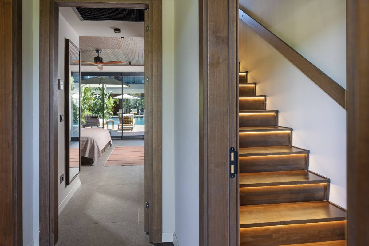 Alt katta oturma alanı, duş ve havuza açılan teras; üst katta ebeveyn ve çocuk yatak odaları ile ikinci banyo bulunur.